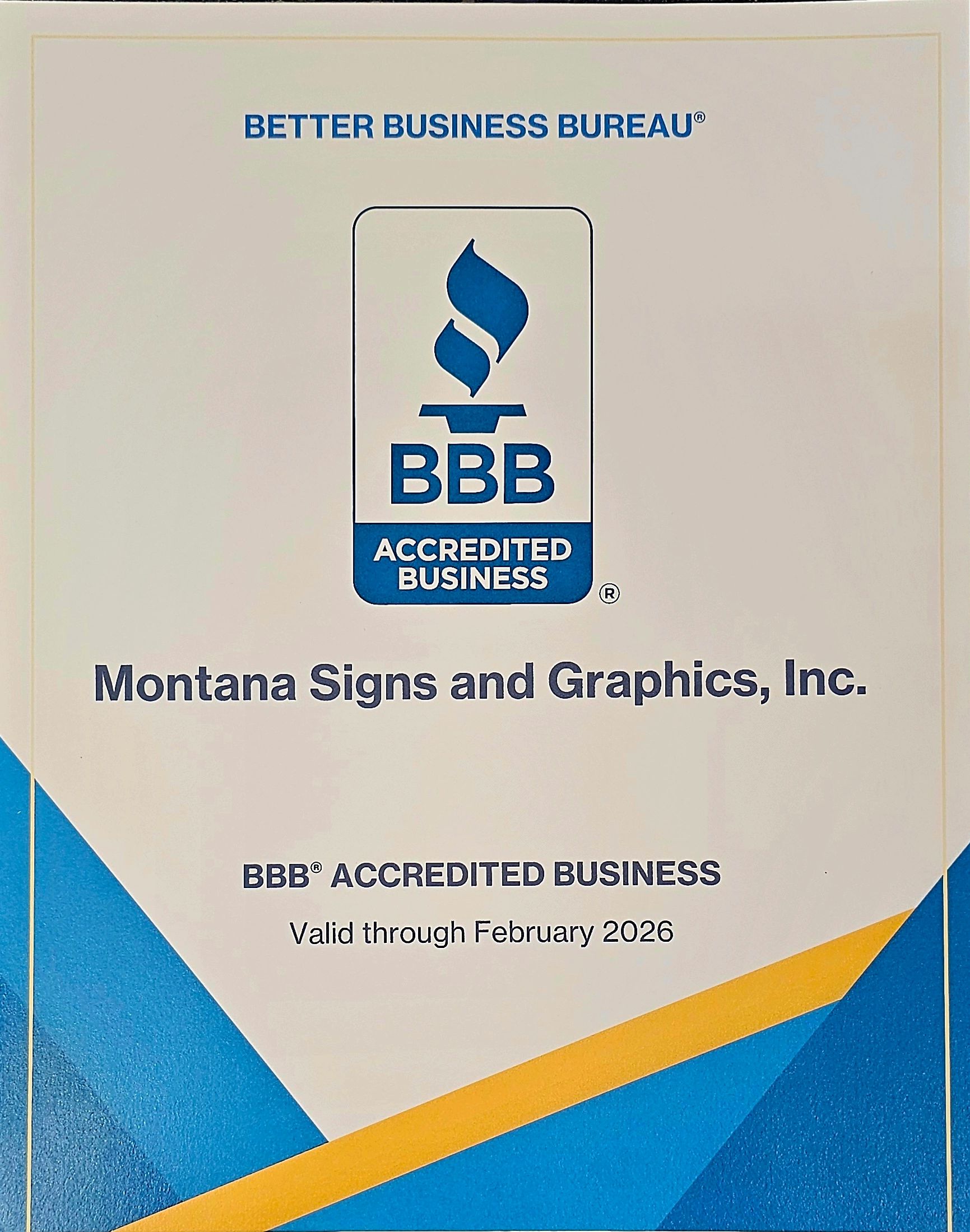 Montana Signs and Graphics Inc. has demonstrated that it meet Better Business Bureau standards of Trust and Commits to uphold the mission, services and standards of ethical business practices needed for Better Business Bureau Accreditation.